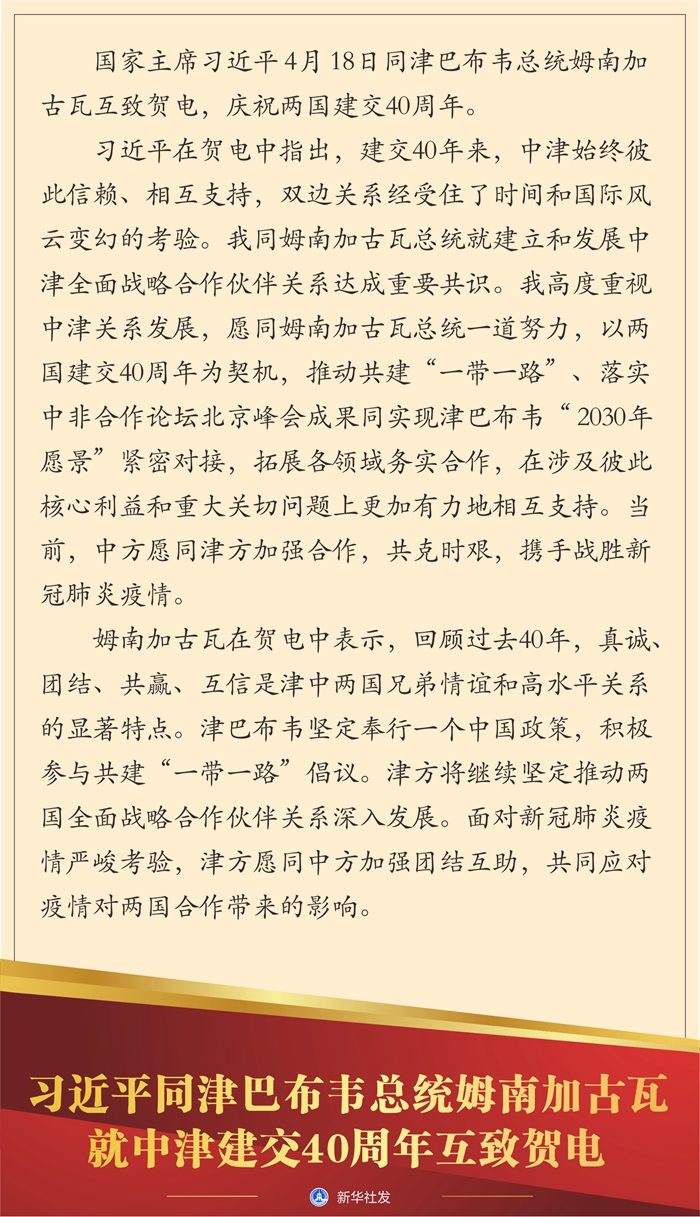 習近平在賀電中指出,建交40年來,中津始終彼此信賴、相互支持,雙邊關系經受住了時間和國際風云變幻的考驗。我同姆南加古瓦總統就建立和發展中津全面戰略合作伙伴關系達成重要共識。我高度重視中津關系發展,愿同姆南加古瓦總統一道努力,以兩國建交40周年為契機,推動共建“一帶一路”、落實中非合作論壇北京峰會成果同實現津巴布韋“2030年愿景”緊密對接,拓展各領域務實合作,在涉及彼此核心利益和重大關切問題上更加有力地相互支持。當前,中方愿同津方加強合作,共克時艱,攜手戰勝新冠肺炎疫情。
