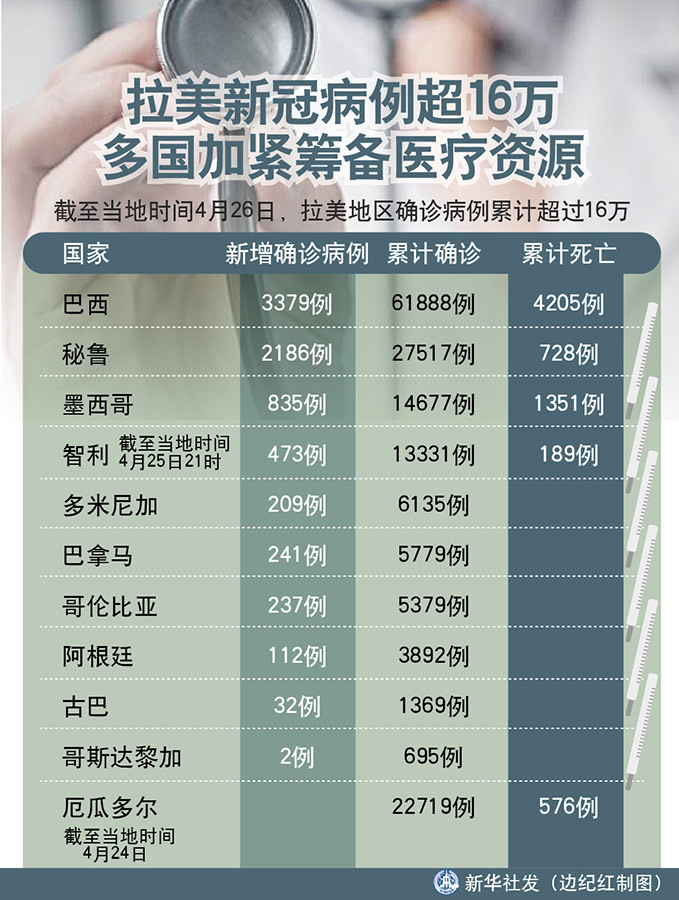 新華社墨西哥城4月26日電 綜合新華社駐拉美地區記者報道:新冠疫情在拉美多國持續蔓延。截至當地時間26日,拉美地區確診病例累計超過16萬。多國政府為應對疫情,加緊籌備醫療物資,增派醫療人員。