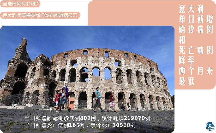 新華社羅馬5月10日電(記者李潔)意大利民事保護部門10日發布的數據顯示,意大利當天新增新冠確診病例802例,累計確診219070例;新增死亡病例165例,累計死亡30560例。單日新增確診病例和新增死亡病例均為過去兩個月來最低水平。