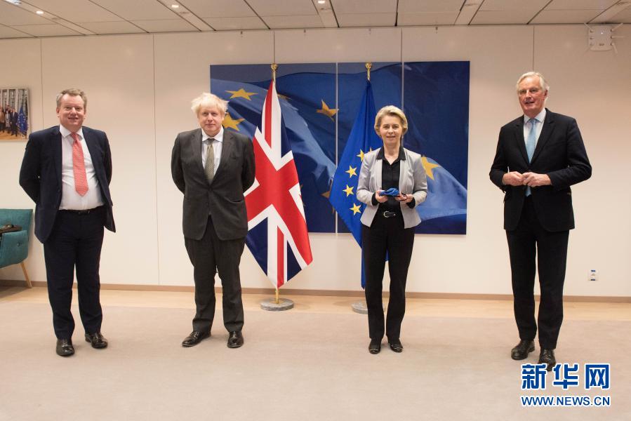 12月9日,在比利時布魯塞爾,(從左至右)英國“脫歐”談判首席代表弗羅斯特、英國首相約翰遜、歐盟委員會主席馮德萊恩以及歐盟負責與英國談判的首席代表巴尼耶在會晤后合影。新華社發(歐盟供圖)