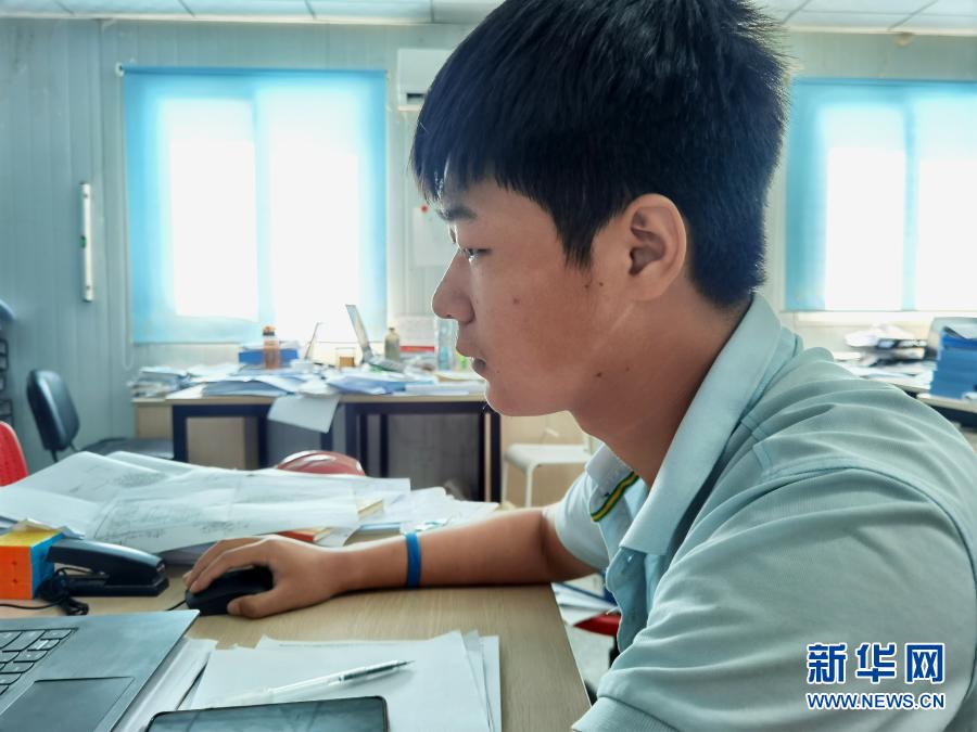 12月14日,在馬爾代夫馬累,臉上有口罩印的安全工程師劉平建在維拉納國際機場水飛航站樓項目辦公室工作。新華社發(北京城建集團供圖)