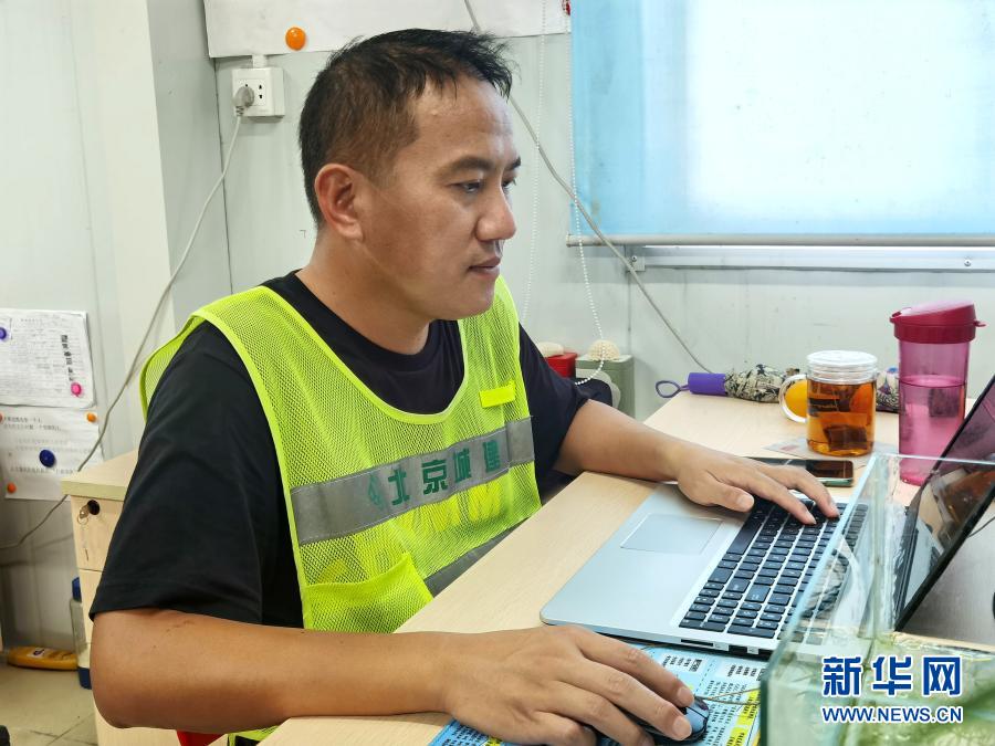 劉平建經常在工地辦公,在回到營地摘下口罩擦汗的一瞬間,記者注意到,由于長期佩戴口罩暴露在烈日之下,他的臉上已經留下一道鮮明的口罩印。